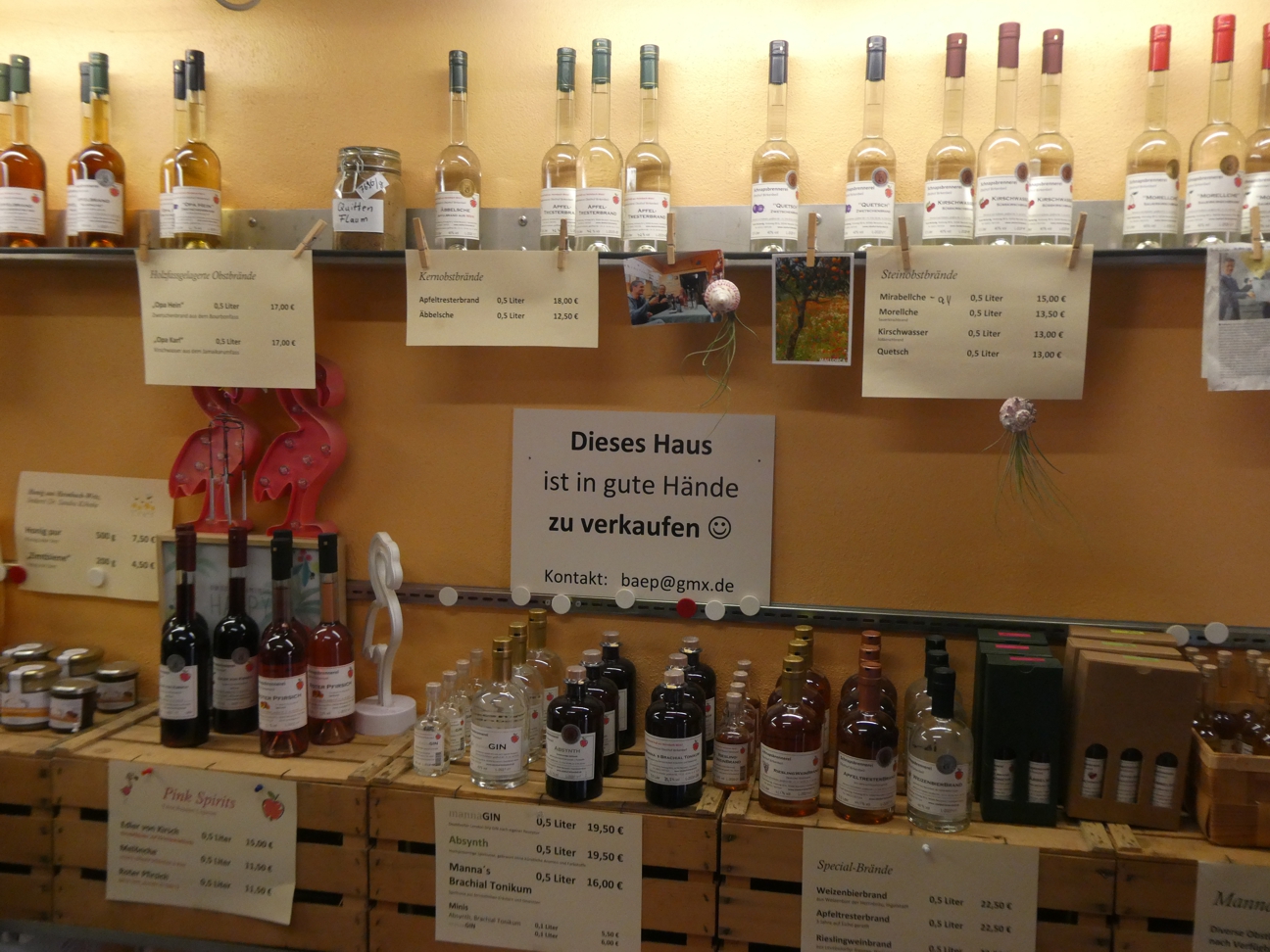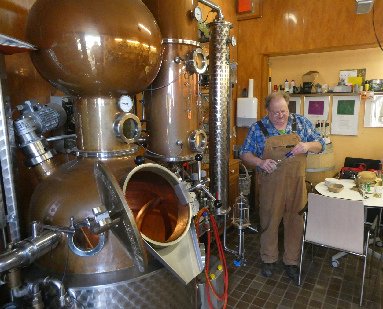 Irgendwann werden wir weitermachen mit dem Apfelbrand Amerikanische Art aus dem Weißeichefass, der soll manchen Whisky-Kenner „auf den Holzweg“ geführt werden. Neugierig macht auch der Apfelbrand auf Französische Art aus dem Limousineichefass; er soll an einen gepflegten Weinbrand erinnern. Es gäbe noch die „Dicke Birne“ oder einen Quittenbrand, das „Morellche“ oder das „Mirabellche“. Neben all diesen Obstbränden entstehen auch Gin, Absynth und verschiedene Liköre. Und manchmal entsteht eine Spezialität, bei der man einfach staunt – wie zum Beispiel ein Karottenbrand, mit vollem Möhrchen-Aroma.